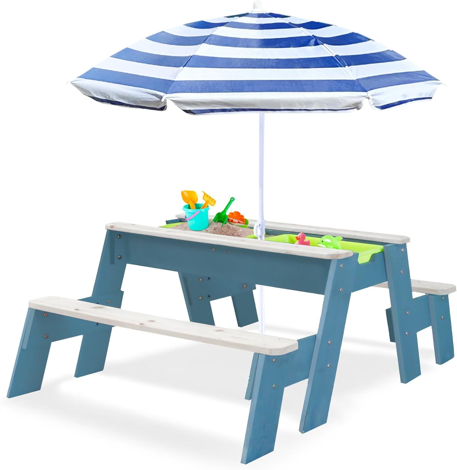 - Versatile 3-in-1 Design: Easily convert this picnic table into a sand or water play area by simply removing the top to reveal two durable plastic activity bins. Add an adjustable umbrella for extra shade and fun.