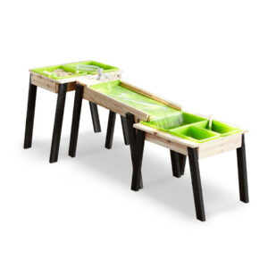Exciting adventures await! Introducing our Sand & Water Aquaflow Table Max, a multi-level sensory system designed to ignite your child's creativity. Featuring three separate tables and a functional water tap, this setup creates a "rushing river" effect, allowing children to embark on thrilling adventures right in their own backyard.
